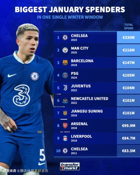 01-10 19:20盘点足坛冬窗花费榜:切尔西23年3.3亿欧居首 曼城25年2.18亿欧次席